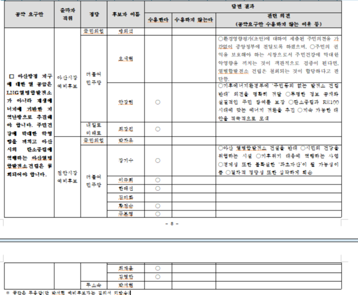 질의 내용은 “아산탕정지구 열 공급을 LNG 열병합발전소가 아닌 재생에너지 기반 방식으로 전환하고, 주민 건강과 탄소중립에 역행하는 발전소 건설을 철회해야 한다”는 단일 공약 요구안에 대한 수용 여부를 묻는 형식이었다.