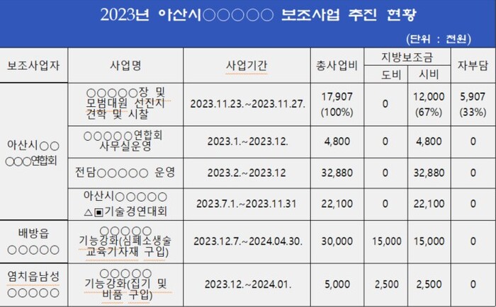 그런데 아산시는 보조사업자가 제출한 실적보고서를 토대로 지방보조사업이 법령 및 교부결정 내용 등에 적합하게 수행 되었는지 확인하여야 했음에도 아무런 조치없이 적정하게 집행된 것으로 정산보고하는 등 실적보고서 심사를 소홀히 한 사실이 드러났다.