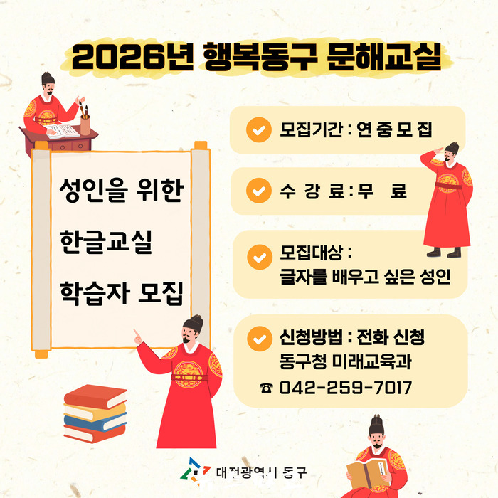 박희조 동구청장은 "문해교육은 일상생활의 불편을 해소하고 삶의 질을 높이는 기초 교육"이라며, "앞으로도 누구나 배움에서 소외되지 않도록 문해교육 지원을 지속적으로 확대해 나가겠다"고 강조했다.