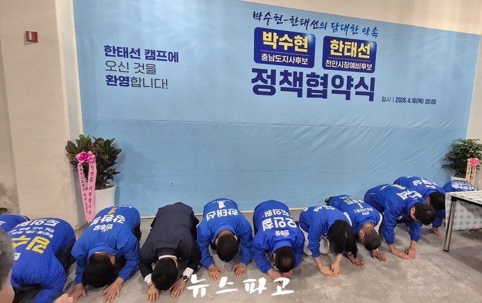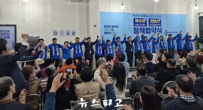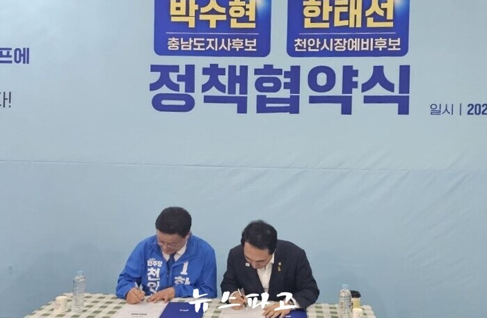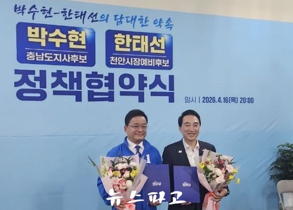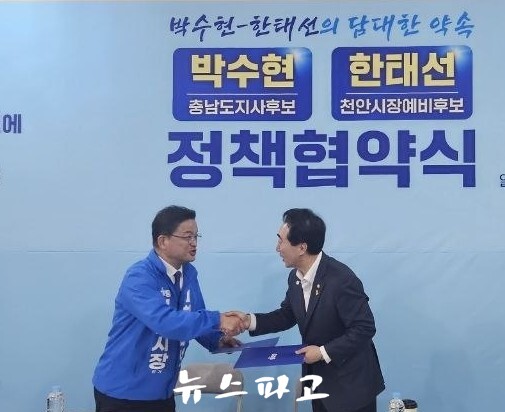 [뉴스파고=한광수 기자] 더불어민주당 한태선 천안시장 예비후보와 박수현 충남지사 후보가 천안의 미래 비전을 설계하기 위해 손을 잡았다. 두 후보는 16일, 한태선 후보 선거캠프에서‘박수현-한태선의 담대한 약속’을 주제로 정책협약식을 개최했다.