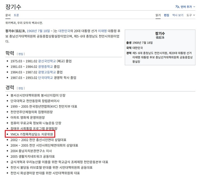박영의 전 소장은 최근 SNS를 통해 2002년 장기수 후보의 시의원 출마 당시 경력 기재에 대한 폭로를 이어갔다. 박 전 소장은 “2002년 장 후보가 찾아와 자문위원으로 한 줄 올려달라고 부탁해 존재하지도 않는 직함을 승낙했었다”며 “그 경솔했던 결정을 지금도 후회한다”고 밝혔다. 그는 증거로 당시 천안YWCA 위원단 명부를 공개하며 장 후보의 경력이 허위임을 주장했다.