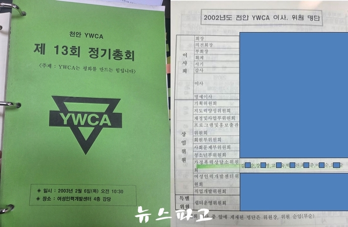 이에 박 소장이 제시한 2002년 당시 천안YWCA의 실제 위원단 명부를 확인하니, 해당 책자에는 2002년 천안 YWCA 이사회에 회장과 직전회장 등의 명단이, 상임 위원에는 기획위원회, 지도력양성위원회, 재정 및 사업부위원회, 프로그램 및 홍보출판위원회, 회원부위원회, 사회문제부위원회, 청소년부위원회, 가정폭력상담소위원회, 여성인력개발센터위원회, 직업개발위원회 각각의 명단이 , 특별위원에는 쉼터운영위원회 각각의 명단에 실려있고, 자문위원은 없다. 가장 비슷한 가정폭력상담소위원회에도 장기수란 이름은 없었고, 다른 이사회, 상임위원, 특별위원 어디에도 장기수란 이름은 들어있지 않았다.