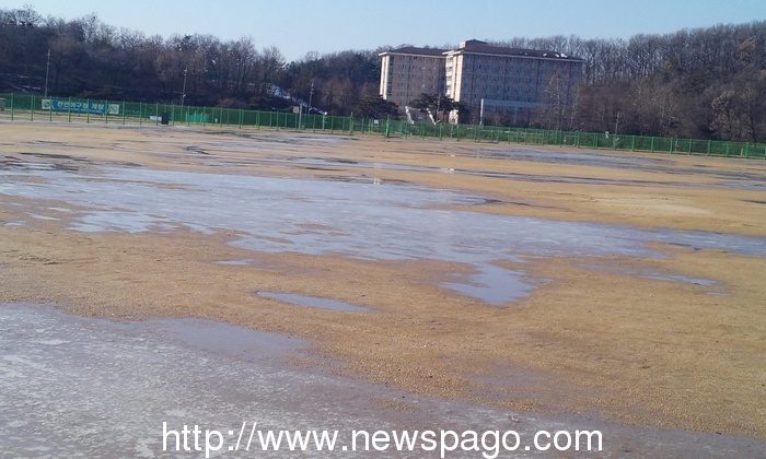 하지만 준공된 천안야구장은 개장하자마자 비가 조금만 와도 땅이 질퍽거리는 등 배수가 전혀 되지 않아 야구게임을 할 수 없는 상태로 지속됐고, 최근까지도 마지막으로 8mm의 눈이 내린 지난 해 12월 29일 이후 열흘이 지났지만, 야구장 바닥 대부분은 물과 빙판으로, 흡사 비온 후의 대지 조성 공사장을 방불케 했다.
