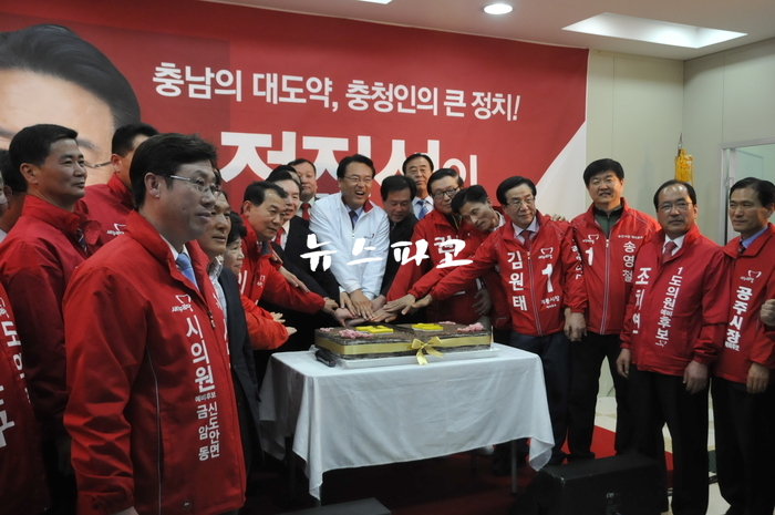 전용학 박상돈 등의 잇따른 지지선언에 힘을 얻고 있는 정진석 새누리당 충남도지사 예비후보는 6일 오후 천안시 동남구 터미널 인근의 캐럿빌딩에서 성황리에 개소식을 갖고 세를 과시했다.