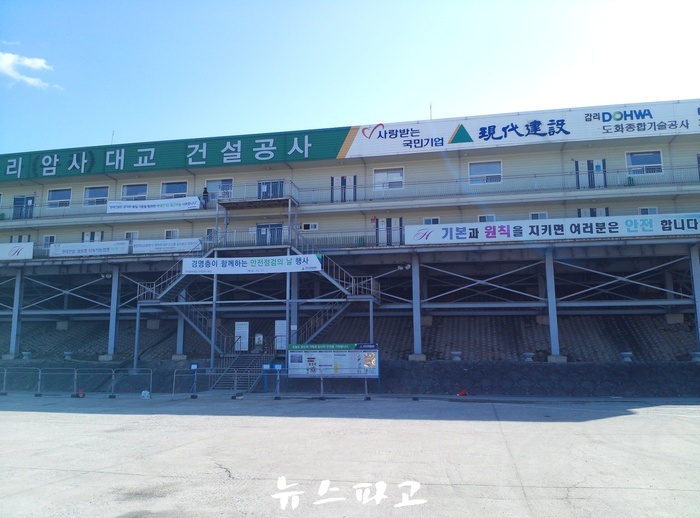 또 암사동에 위치한 구리암사대교 현대건설 현장사무소를 방문해 확인한 결과 암사대교 현장에는 아직 설치는 되지 않은 상태지만, 계약 이후 발주한 제품 설계속도 80km용 7개를 납품 받아설치를 위해 납품사가 특정 장소에서 조립중이란 설명을 들었다. 해당 시험성적서와 설계도면의 확인을 요청하니, 현대건설 관계자는 '충격흡수시설 상세도'라고 씌어진 A4용지 한 장을 보여주며, 시험성적서는 아직 없어 납품사에 요구할 계획이라고 말했다. 하지만 이는 사실이 아니었다. 또 다른 공사 관계철을 넘겨 보니 화흥에서 제출한 시험성적서가 들어 있었다.