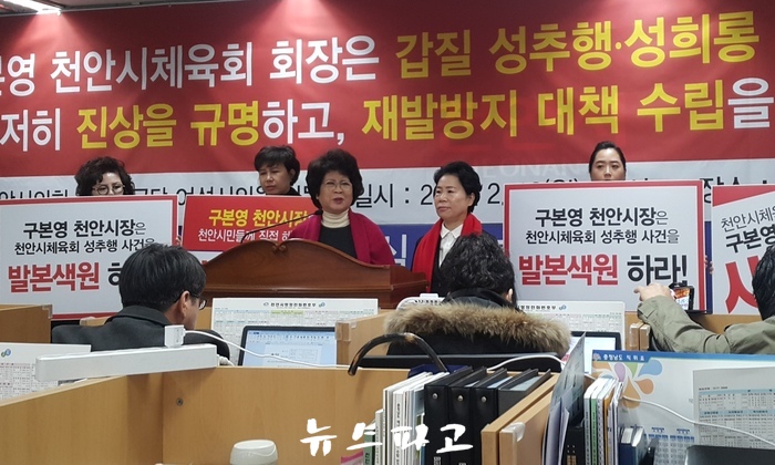 천안시의회 서경원·김행금 의원을 비롯한 자유한국당 충남도당 여성위원들이 천안시체육회 성추행 논란과 관련해 구본영 시장의 공식사과를 촉구하고 나섰다.