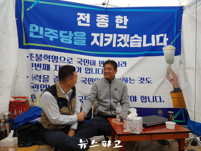 전략공천에 반대하며 이틀째 천막농성을 진행중인 더불어민주당 전종한 천안시장 예비후보가 박상돈 자유한국당 예비후보를 향해 또다시 쓴소리를 내뱉었다.