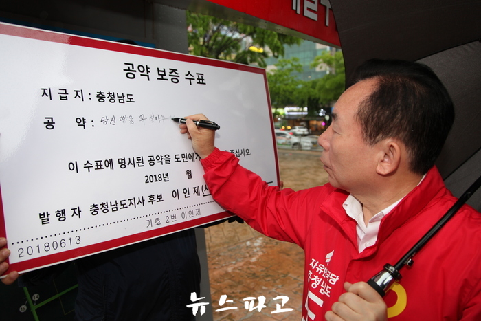 지난 한 달 동안 충남지역 15개 시·군 민생탐방을 통해 도민들에게 청취한 건의 사항에 대하여 정책 공약으로 답하는 일정을 진행 중인 이인제 자유한국당 충남도지사 후보는는 12일 당진을 찾아 자유한국당 오성환 당진시장 후보 개소식에 방문해 충남의 핵심 이슈 중의 하나인 당진항 인근 공유 수면 매립지 귀속 문제에 관하여 오성환 당진시장 후보와 함께 공동 공약을 발표했다.