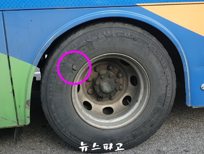 [뉴스파고] 비용절감을 위해 재생타이어를 사용하고 있는 천안시내버스. 뒷타이어는 재생타이어를 사용해도 된다는 규정에 따른 합법적인 행위라지만, 이를 바라보는 시민들은 불안하기만 하다.