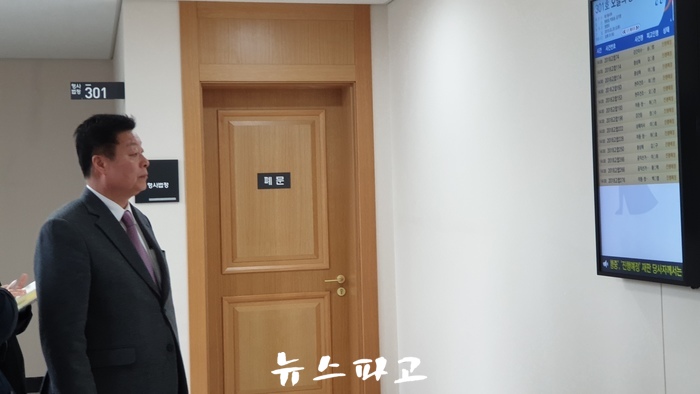 | ▲ 지난 20일 선고공판에 앞서 법정 입구에서 사건관련 전광판을 보고있는 이규희 의원 모습 ©뉴스파고 |